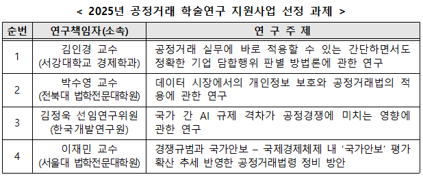 조정원은 2008년부터 공정거래 분야 학술연구 기반 강화와 저변 확대를 위해 공정거래 학술연구 지원사업을 운영해오고 있다.